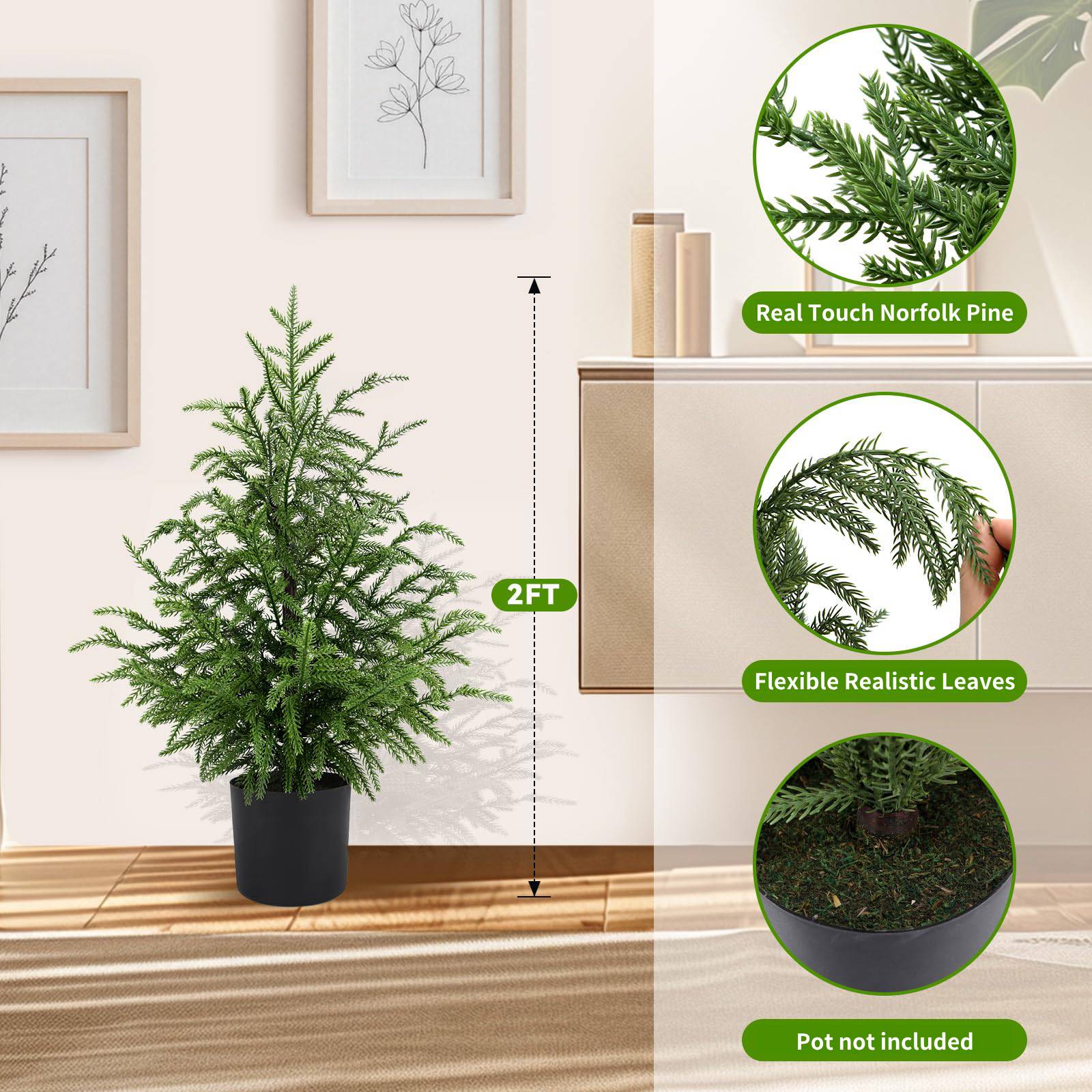 No Assembly or Maintenance Required - The Artificial norfolk pine tree is 2 feet /24 inches tall. Simply unbox and display—no watering, shedding, or upkeep needed. Great for busy homes, rentals, or office spaces.